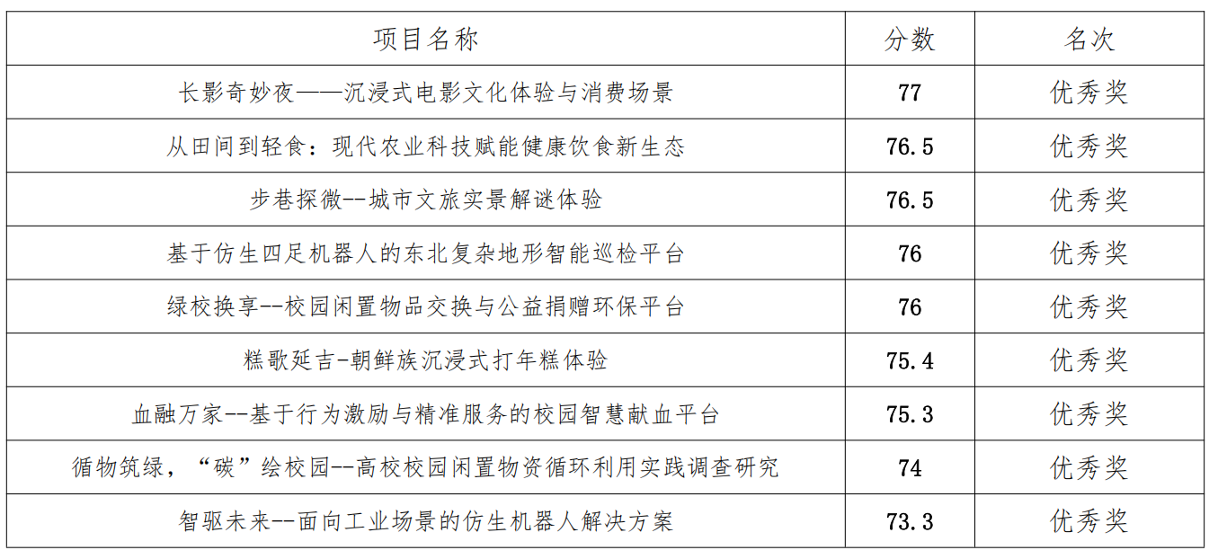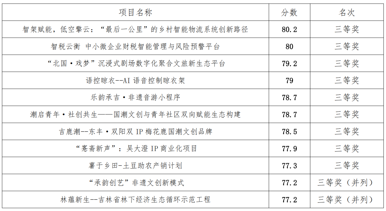 根据《关于举办2026年“挑战杯”吉林省大学生创业计划竞赛的预通知》的相关工作安排,学校组织开展2026年“挑战杯”大学生创业计划竞赛校赛,本次竞赛经过个人申报、各教学院推荐、专家线上盲审、校内评审,评选出40件获奖作品,其中:一等奖10件,二等奖10件,三等奖11件,优秀奖9件。现予以公示: